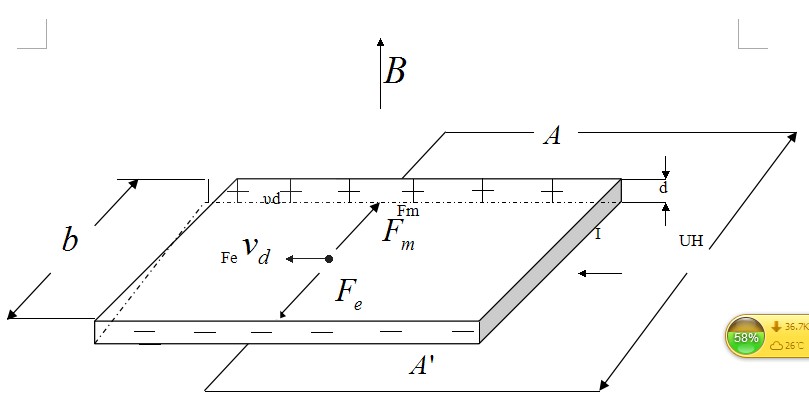 所謂霍爾效應(yīng):相當(dāng)于把一塊寬為b,厚為d的導(dǎo)電板放在磁感應(yīng)強(qiáng)度為B的磁場(chǎng)中,并在導(dǎo)電板中通以縱向電流I ,此時(shí)在板的橫向兩側(cè)面A、A′,之間就呈現(xiàn)出一定的電勢(shì)差,這一現(xiàn)象稱(chēng)為霍爾效應(yīng),所產(chǎn)生的電勢(shì)差UH稱(chēng)霍爾電壓。高斯計(jì)就是利用這一原理來(lái)測(cè)量磁場(chǎng)強(qiáng)度的。如圖所示: